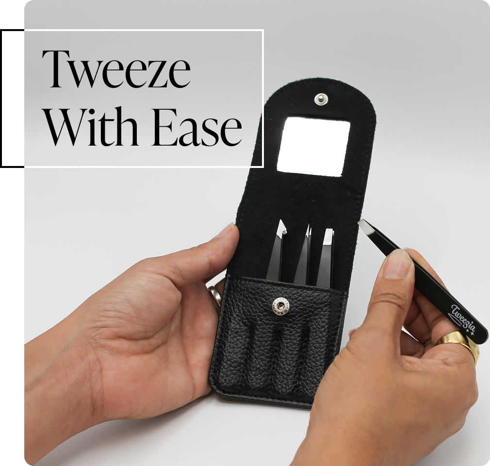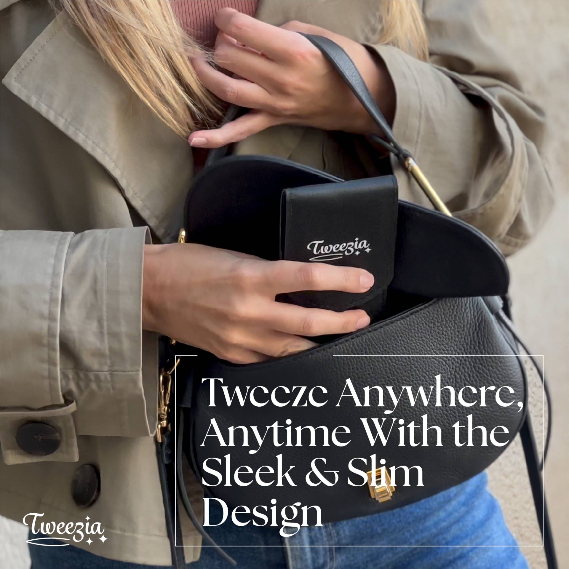 - Travel Light with the Slim & Stylish Case: TWEEZIA Tweezers come in a sleek leather case that’s easy to pack in your suitcase, carry-on, or commuter bag.